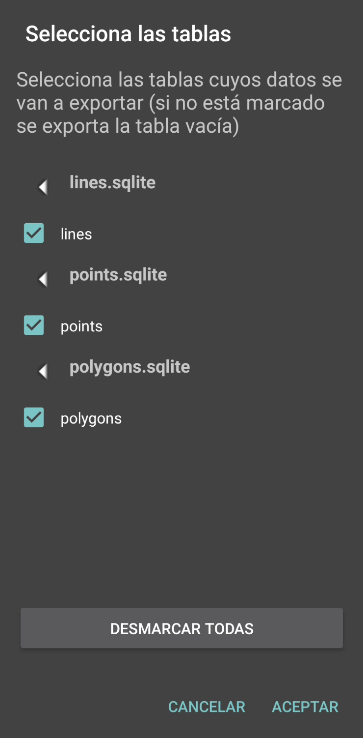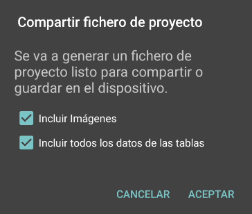 • Ficheros sqlite con los datos del proyecto. Si hay datos que no quieres compartir, tienes la opción de seleccionar en qué tablas quieres conservar los datos y en cuales solo.