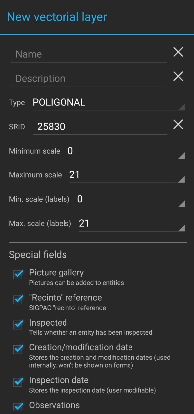 Once the encoding and, if required, the CRS are selected, the Vector Layer creation form will be displayed.