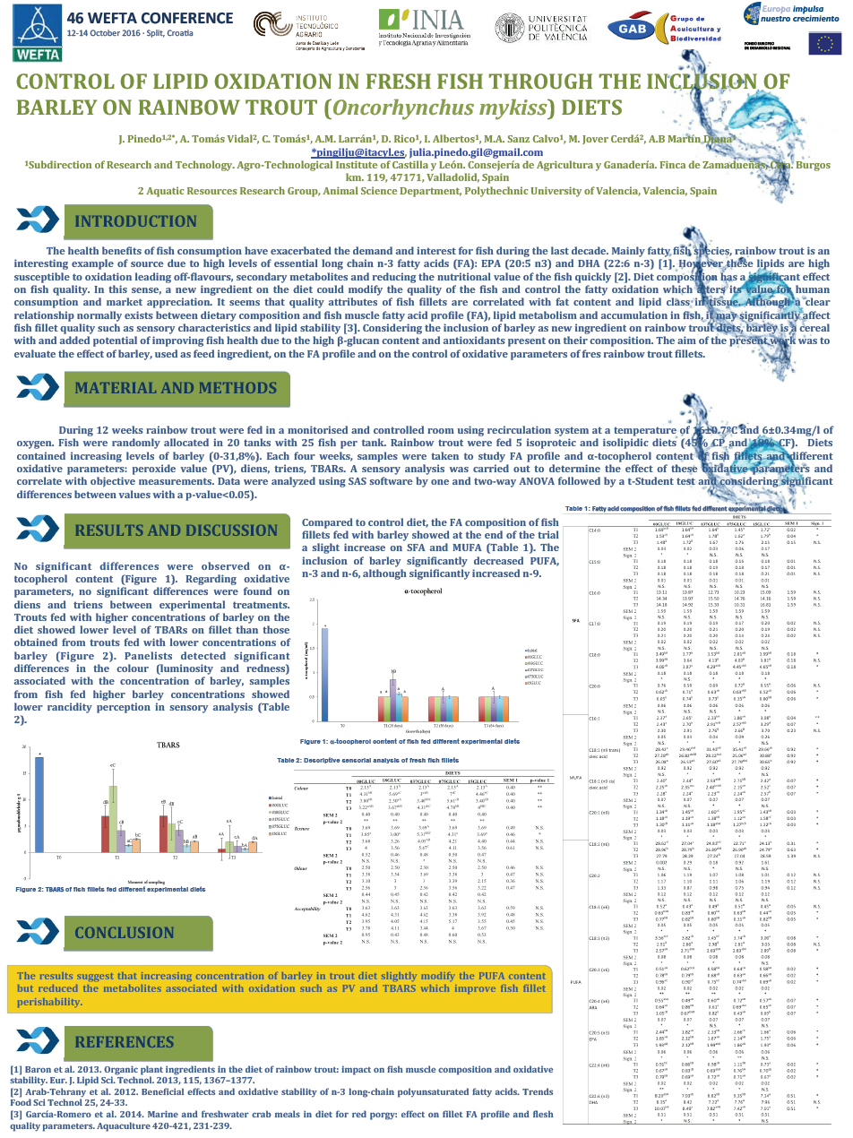 - "CONTROL OF LIPID OXIDATION IN FRESH FISH THROUGHT THE INCLUSION OF BARLEY ON RAINBOW TROUT (Oncorhynchus mykiss) DIETS". 46 WEFTA CONFERENCE, 12 -14 OCTUBRE 2016 SPLIT, CROACIA