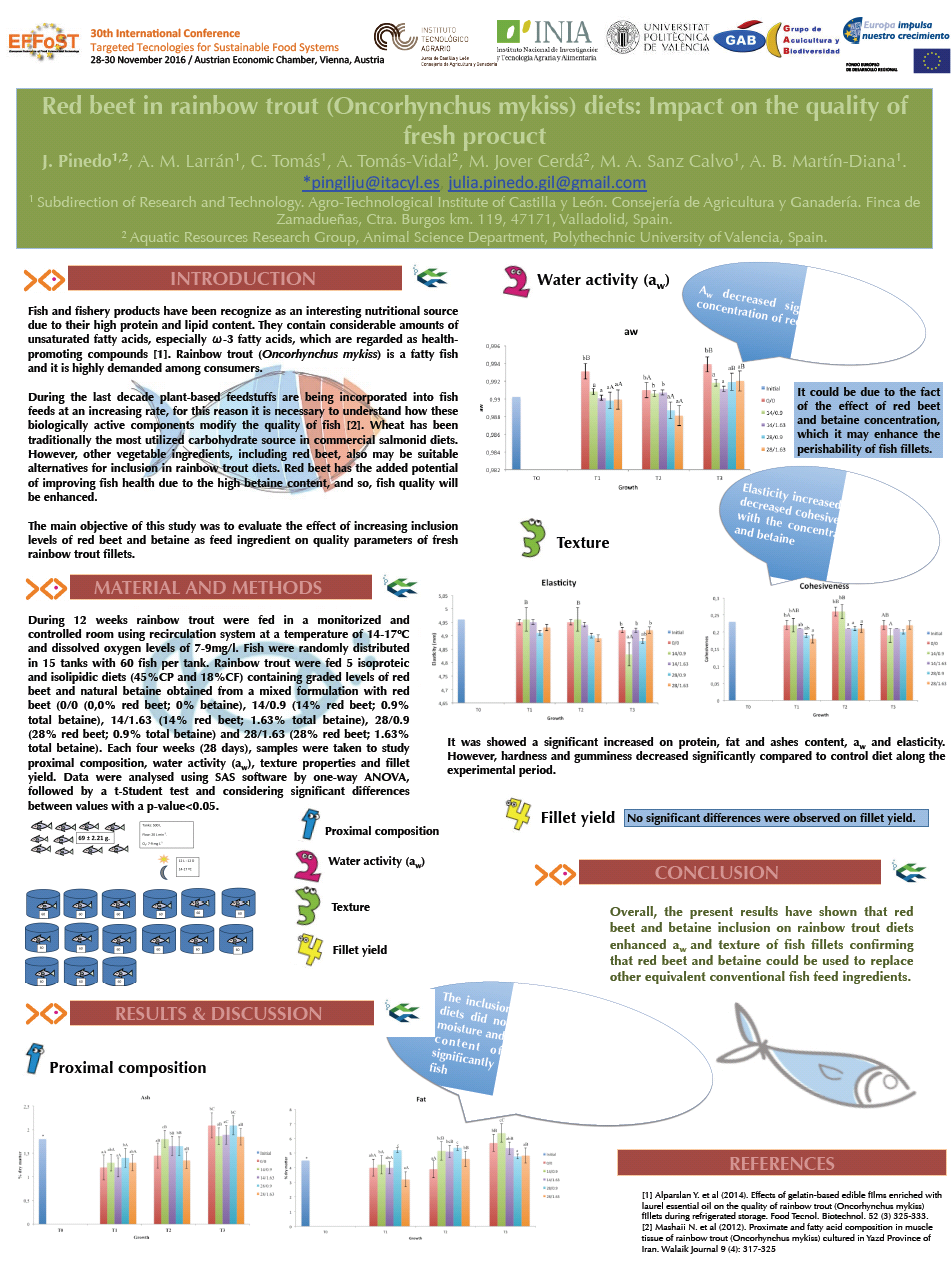 - "Red beet in rainbow trout (Oncorhynchus mykiss) diets: Impact on the quality of fresh product". EFFoST 30 thINTERNATIONAL CONFERENCE, TARGETED TECHNOLOGIES FOR SUSTAINABLE FOOD SYSTEMS, 28 -30 NOVIEMBRE 2016, VIENA, AUSTRIA.