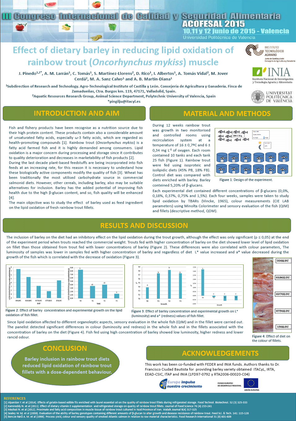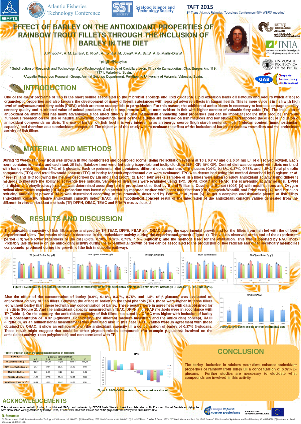 - "EFFECT OF BARLEY ON THE ANTIOXIDANT PROPERTIES OF TAINBOW TROUT FILLETS THROUGHT THE INCLUSION OF BARLEY IN THE DIET". 5 Th TRANS-ATLANTIC FISHERIES TECNOLOGY CONGERENCE (45 ThWEFTA Meeting) 12-16 OCTUBRE 2015 NANTES, FRANCIA