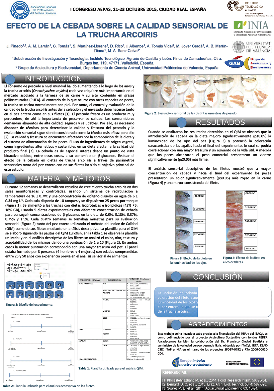- "EFECTO DE LA CEBADA SOBRE LA CALIDAD SENSORIAL DE LA TRUCHA ARCOIRIS". I CONGRESO AEPAS, 21-23 OCTUBRE 2015 CIUDAD REAL, ESPAÑA