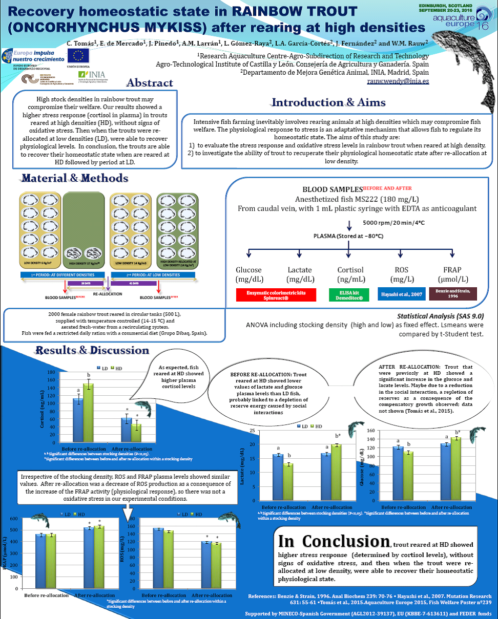 - "Recovery homeostatic state in RAINBOW TROUT (ONCORHYNCHUS MYKISS) after rearing at high densities". AQUACULTURE EUROPE 16, 20- 23 2016 SEPTIEMBRE EDIMBURGO, ESCOCIA