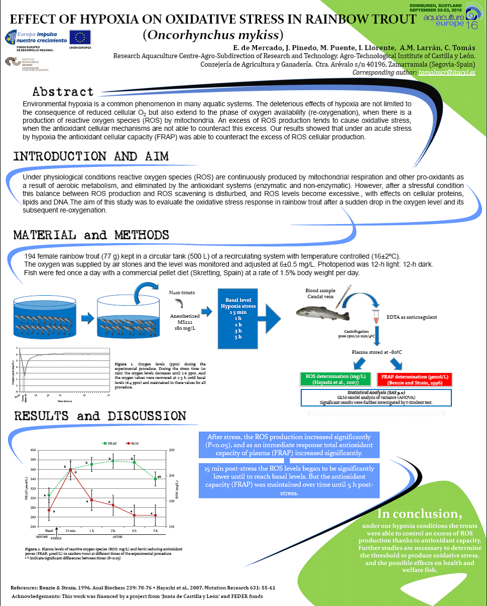 - "EFFECT HYPOXIA ON OXIDATIVE STRESS IN RAINBOW TROUT (Oncorhynchus mykiss)". AQUACULTURE EUROPE 16, 20 - 23 2016 SEPTIEMBRE EDIMBURGO, ESCOCIA