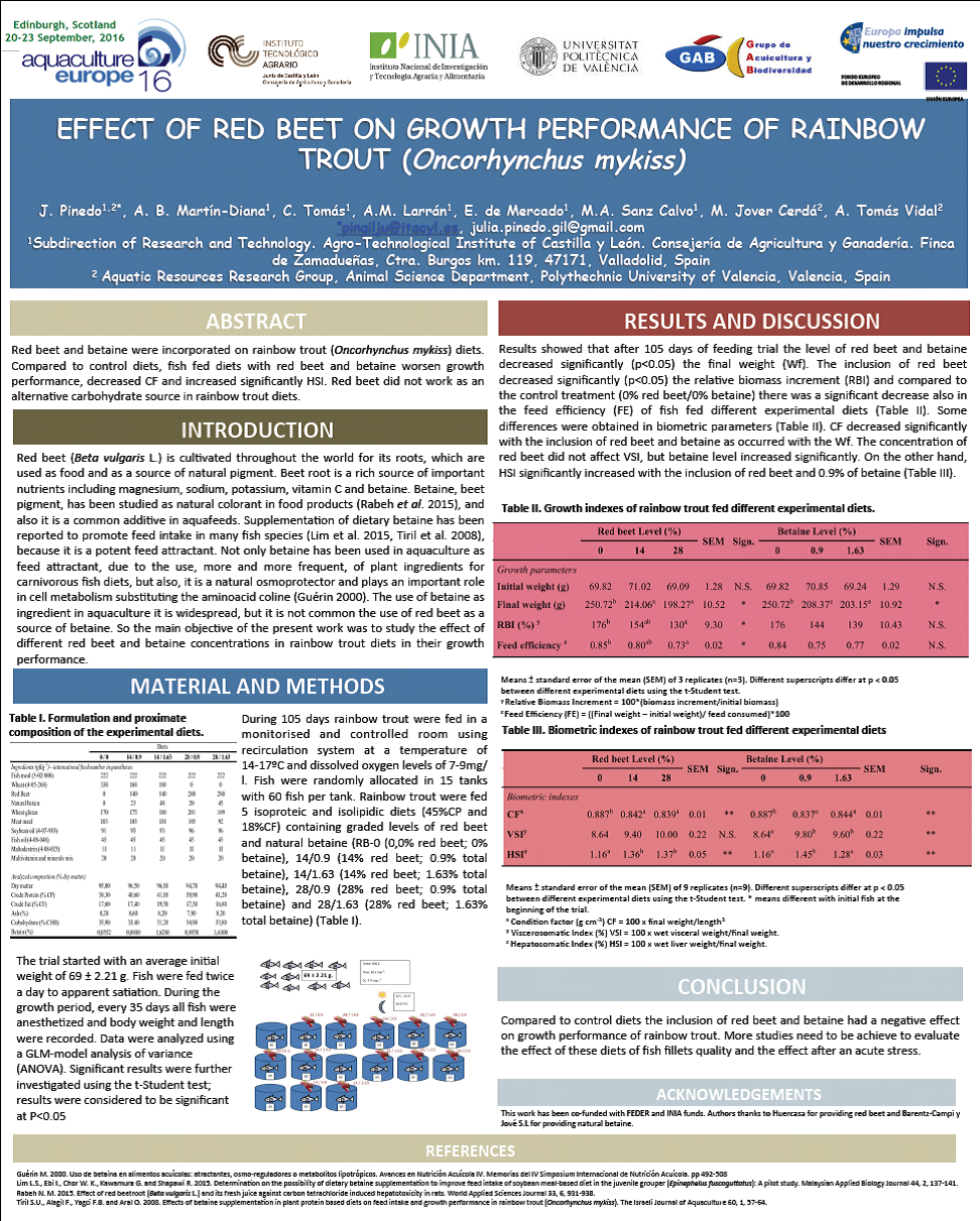- "EFFECT OF RED BEET ON GROWTH PERFONMANCE OF RAINBOW TROUT (Oncorhynchus mykiss)". AQUACULTURE EUROPE 16, 20 - 23 2016 SEPTIEMBRE EDIMBURGO, ESCOCIA
